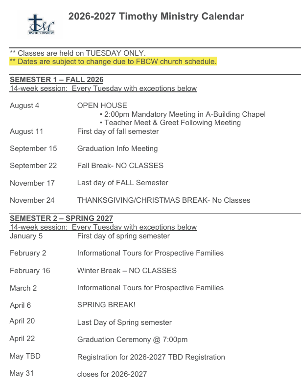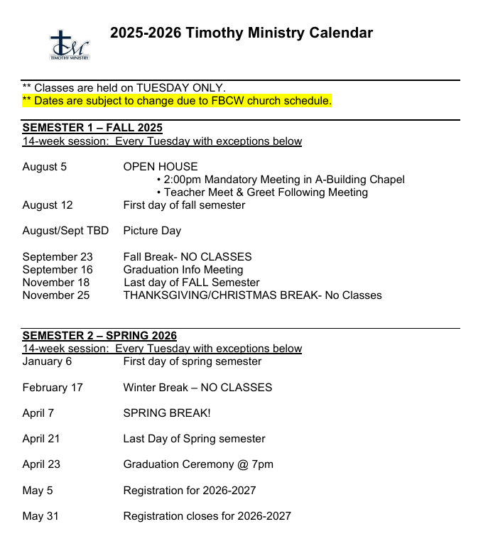Timothy Ministry Calendar